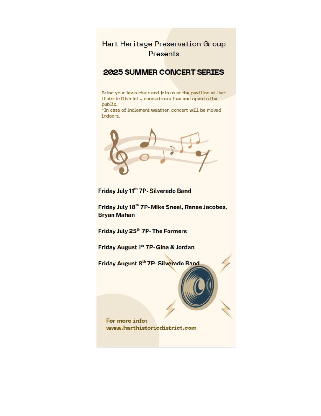 Join the Hart Heritage Preservation Group for their Summer Friday Concert Series! Bring a chair and enjoy free live music every Friday at 7:00 PM at the Historic District Pavilion. Soak up the sounds of summer in a charming, historic setting, fun for all ages!