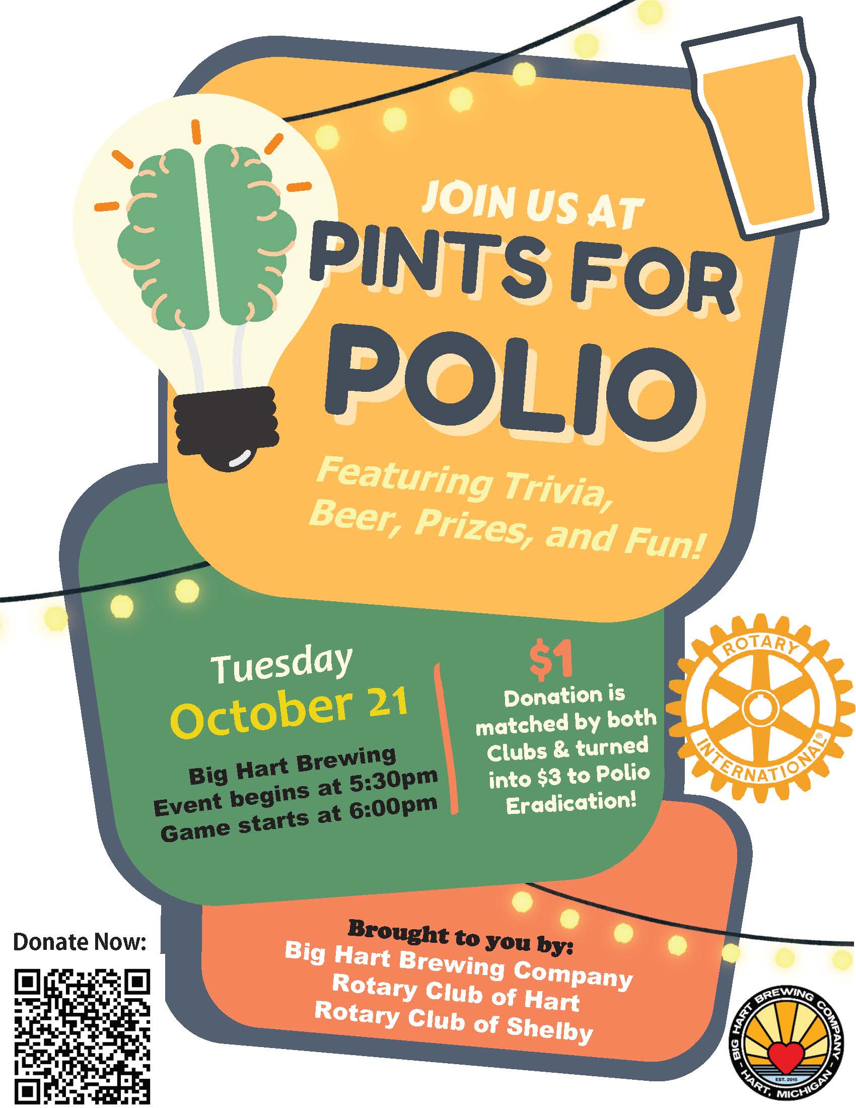 Big Hart Brewing Company will be hosting Pints for Polio on Tuesday, October 21 for a fun night of trivia, beer, prizes, and community spirit, all supporting a great cause! The event begins at 5:30 PM with trivia starting at 6:00 PM. Every $1 donation is matched by both the Rotary Club of Hart and the Rotary Club of Shelby, turning it into $3 toward Polio Eradication. Come enjoy great drinks, friendly competition, and help make a difference!