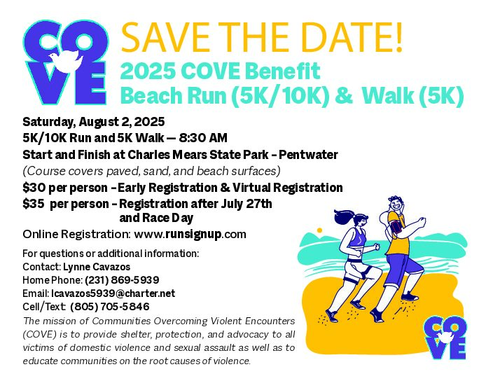 Charles Mears State Park 400 W. Lowell Street, Pentwater, MI, United StatesJoin us on Saturday, August 2, 2025, for the annual COVE Benefit Beach Run & Walk at Charles Mears State Park in Pentwater! Registration kicks off at 7:00 AM and features a 5K/10K run and a 5K walk along a […]